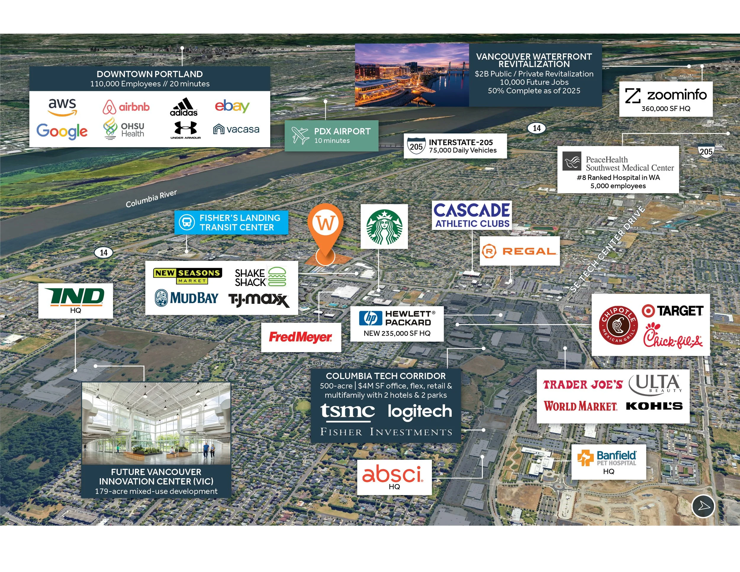 Minutes from downtown Portland, the Vancouver Waterfront, PDX International Airport, and major employment centers via Interstate 205. The property is also located near the Vancouver / Camas Columbia Tech Corridor, home to more than 4 million square feet of office and technology space.